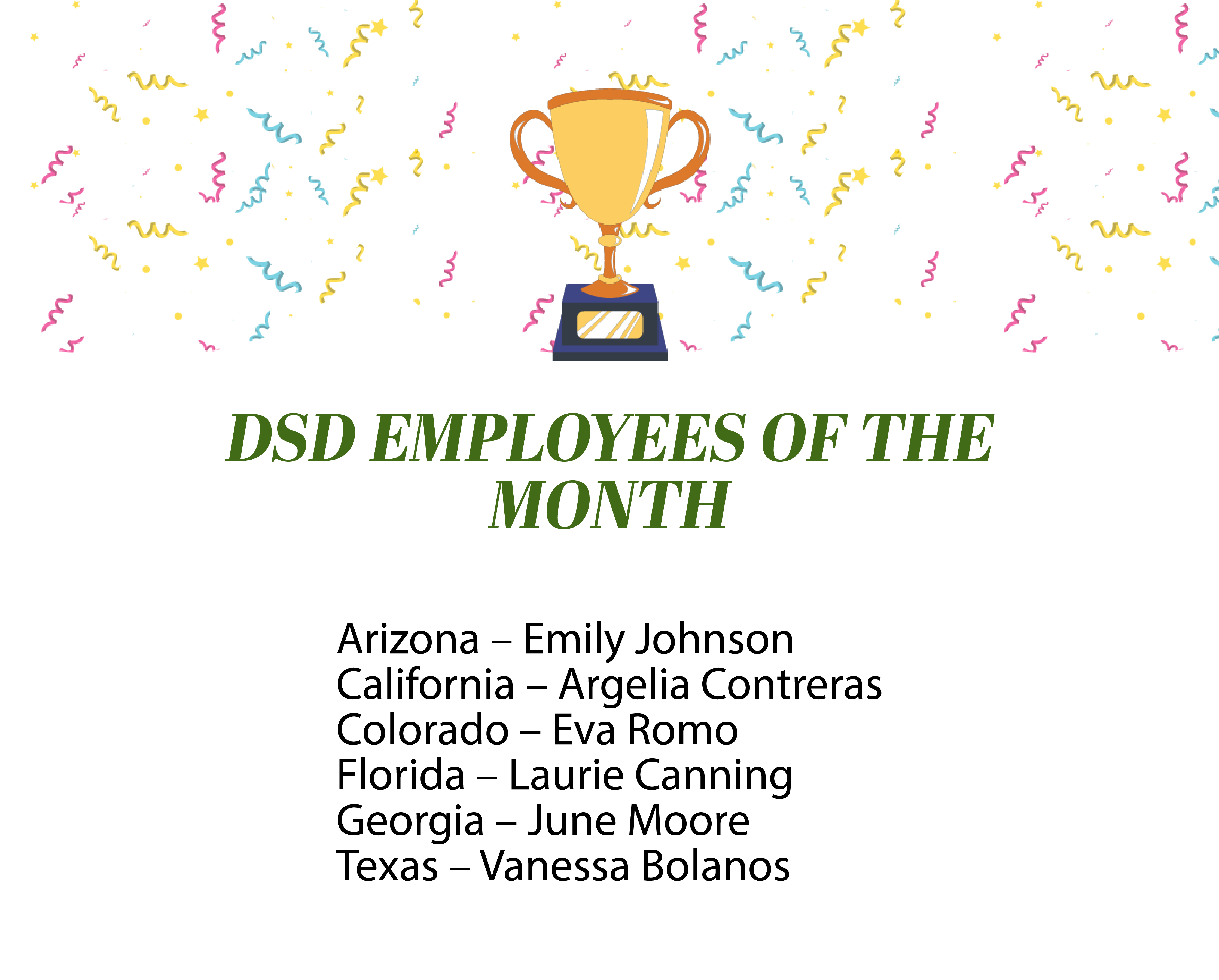 We celebrate our DSD employees of the month! In recognition of their dedication, commitment, and excellence at work we congratulate them for their outstanding performance. Their hard work and contributions make our company an extraordinary place to grow and succeed.